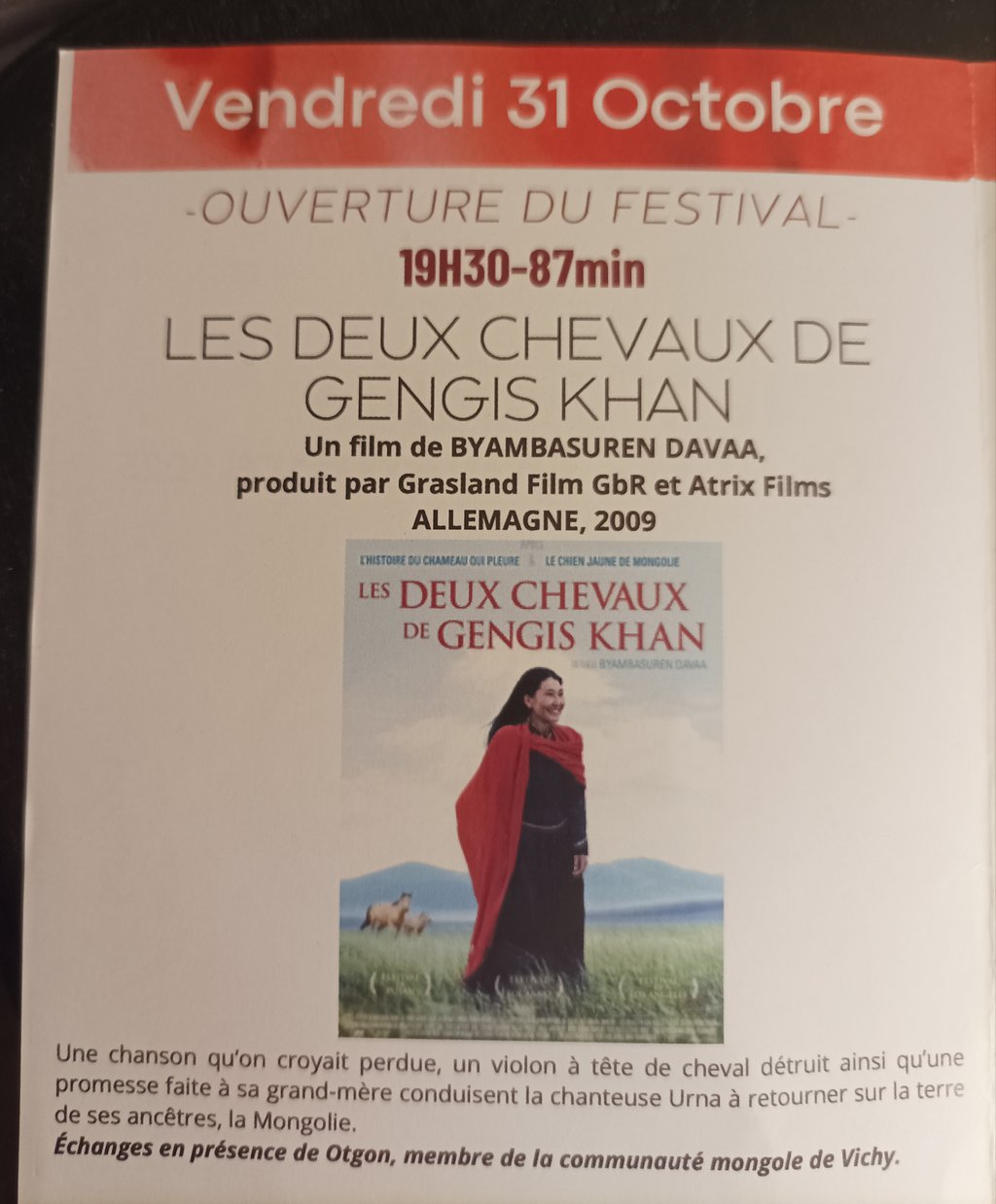 C'est avec un grand plaisir que l'équipe de bénévoles de Ferrières Demain a ouvert la 4ème édition de son festival de films documentaires "Doc d'en Ferr" ce vendredi 31 octobre au Théâtre des Masques avec un film de Byambasuren Davaa de 2009 :