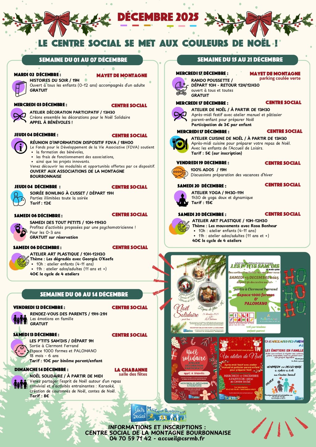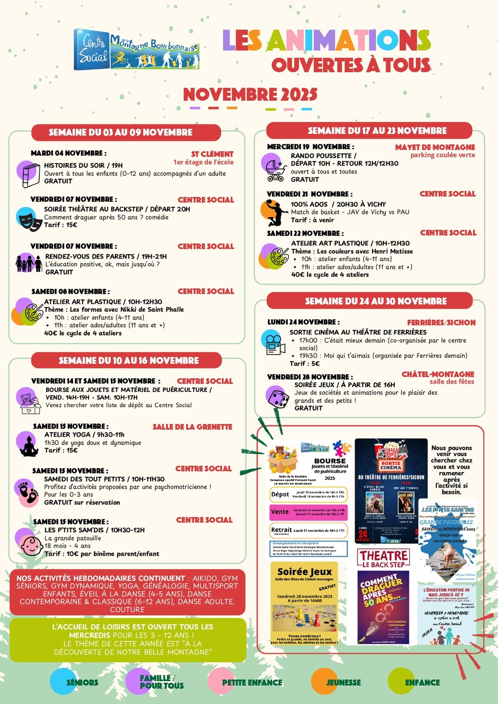 Voici le programme des animations proposées par le Centre Social de la Montagne Bourbonnaise pour la période de Novembre-Décembre.