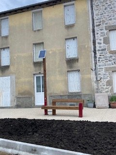 L’E-banc est composé d’un banc, d’une banquette et d’un mât solaire.