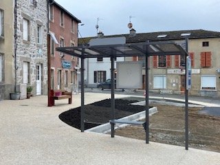 Les travaux de la place de la Poste ont bien avancé ce mois de décembre sur le devant de la boutique du Sichon avec l'installation du nouvel abribus et du "e-banc" (un banc écologique où chacun pourra recharger gratuitement son portable ou sa tablette grâce à l'énergie photo-voltaïque) ainsi que l'aménagement presque terminé de places de parking.