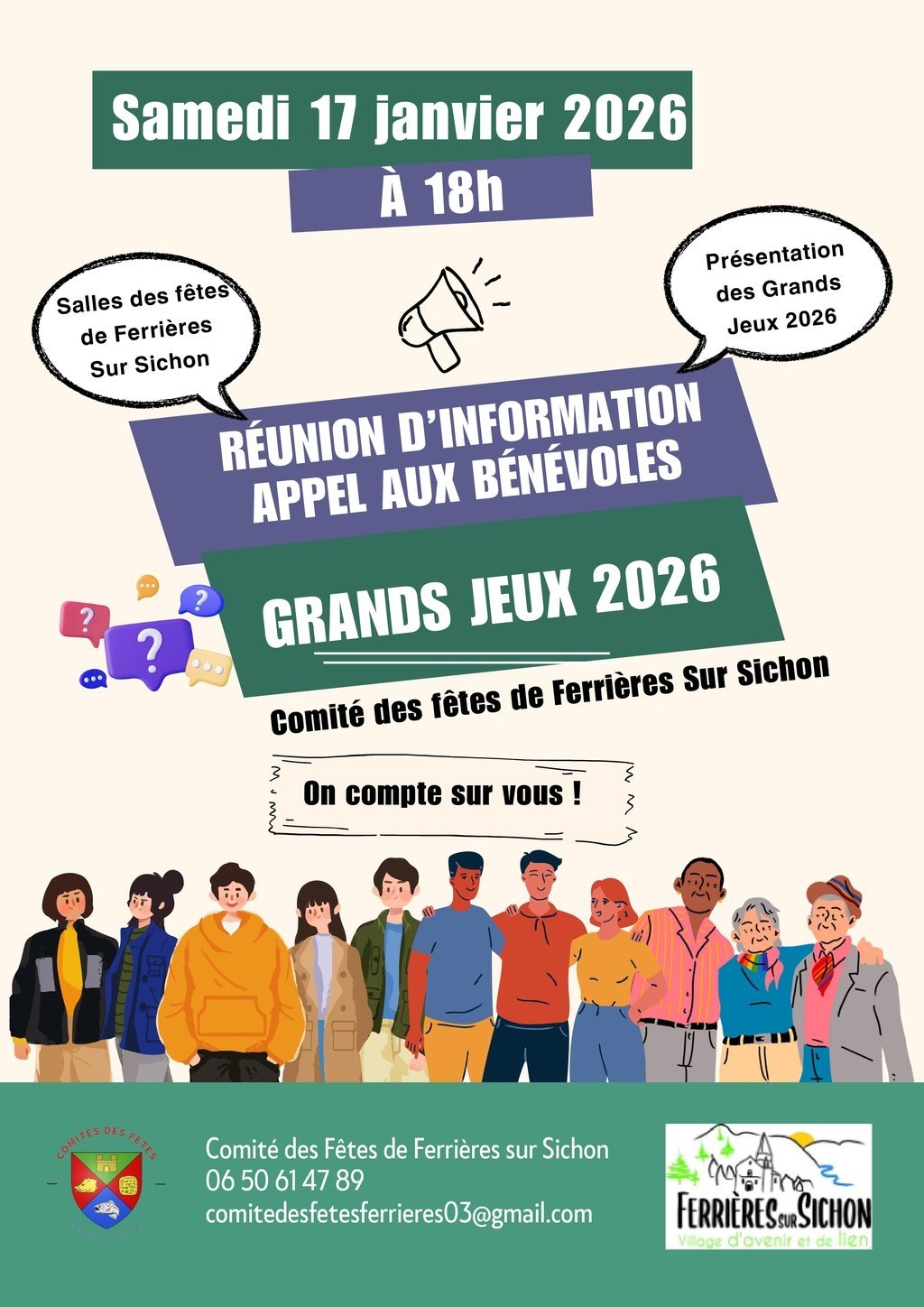 Nous avons le plaisir de vous inviter à une réunion d’information le samedi 17 janvier à 18h à la salle des fêtes de Ferrières-sur-Sichon pour vous présenter l'organisation des Grands Jeux 2026. Cet événement exceptionnel, qui aura lieu le 2 août 2026, s’annonce déjà comme un moment inoubliable pour notre commune, et pour qu’il soit une véritable réussite, nous avons besoin de VOUS !