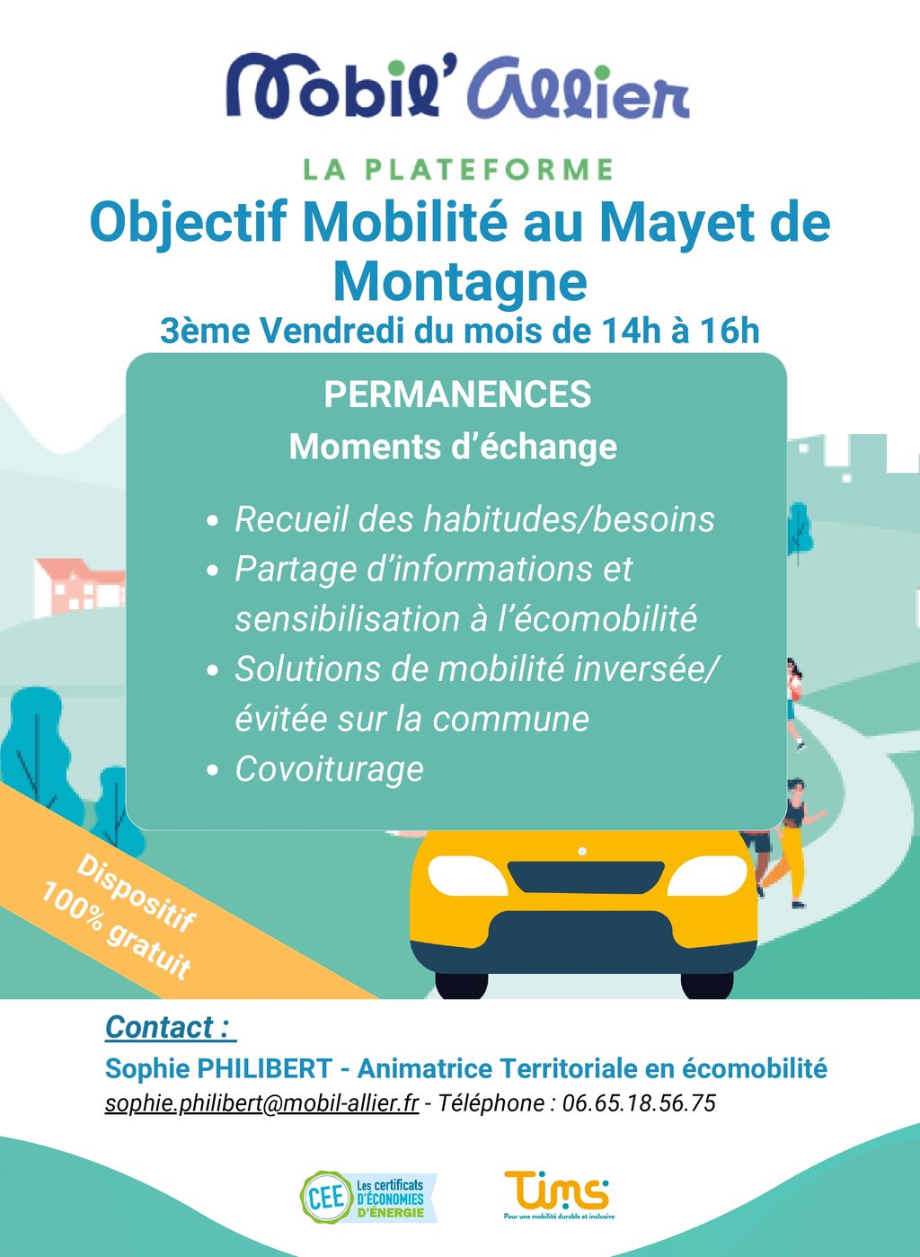 Dans le cadre de notre engagement pour une mobilité plus durable et solidaire sur le territoire, nous avons le plaisir de vous informer de la mise en place d’une nouvelle permanence Mobil'Allier au Mayet-de-Montagne.