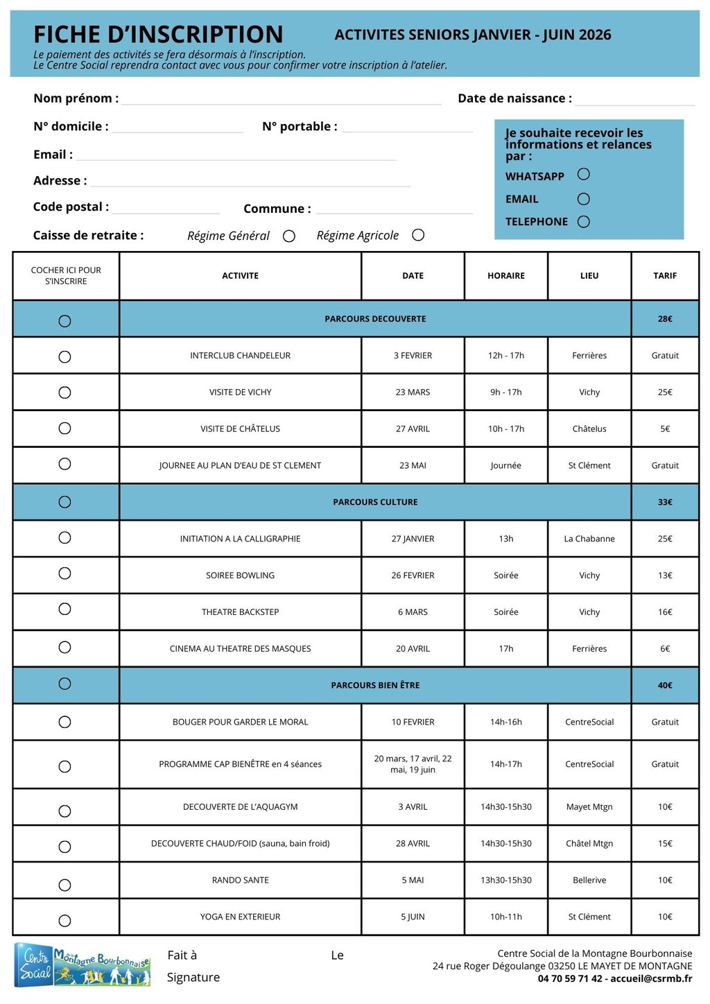 N'hésitez pas à contacter Anne Laure (référente séniors) par téléphone au 04 70 59 71 42, ou à venir la voir à l'accueil du Centre pour échanger plus en détail sur le programme.