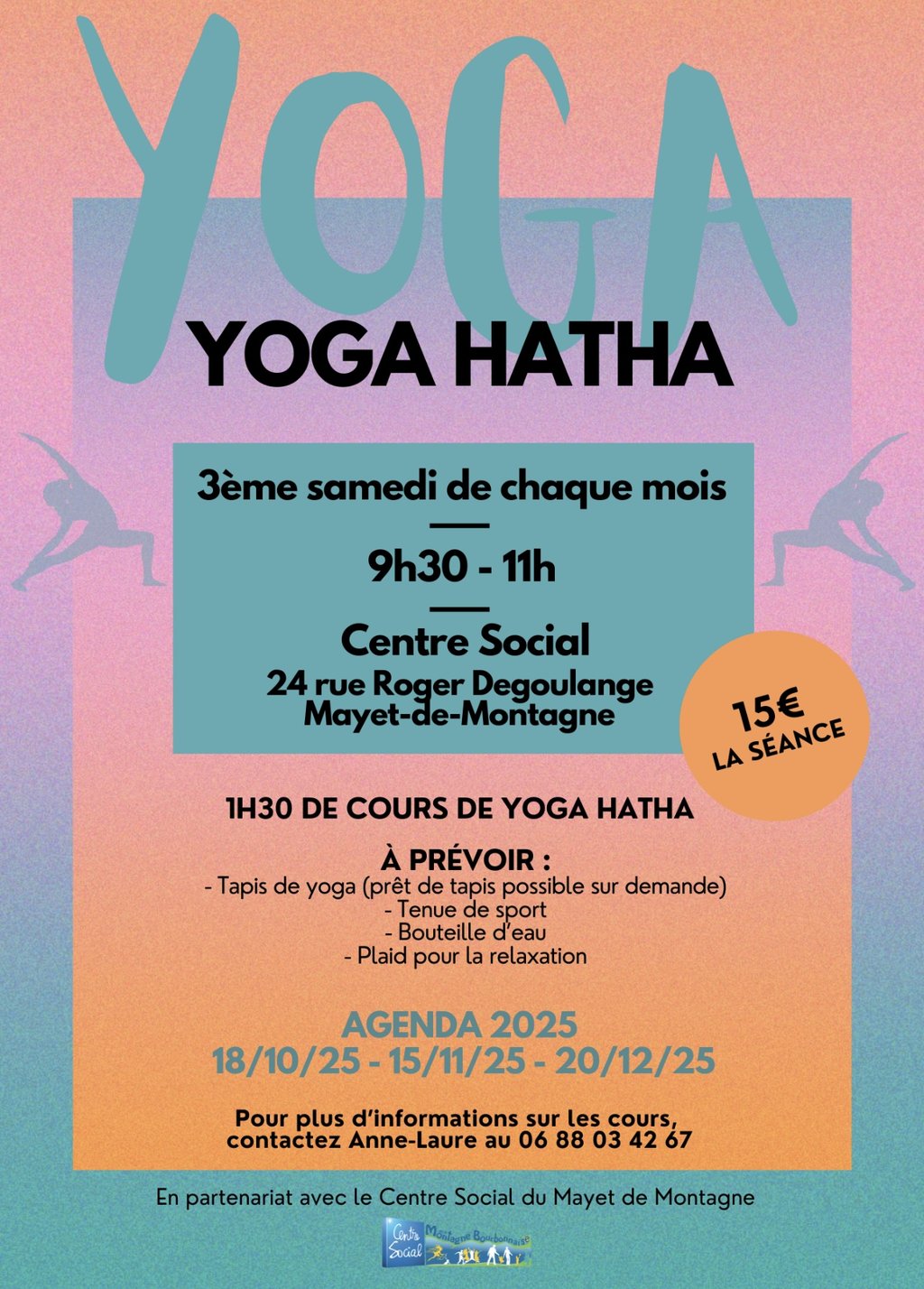 Tous les 3ème samedis du mois, séance de yoga au centre social du Mayet de Montagne.