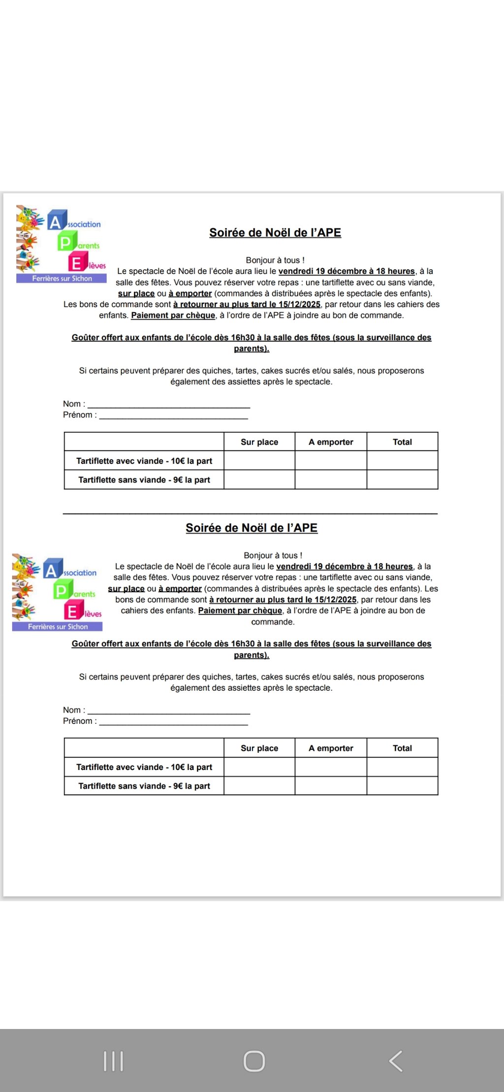 L'APE vous propose une tartiflette avec ou sans viande, sur place ou à emporter, le bon de commande est à retourner le plus vite possible avec un chèque à l'ordre de l'APE