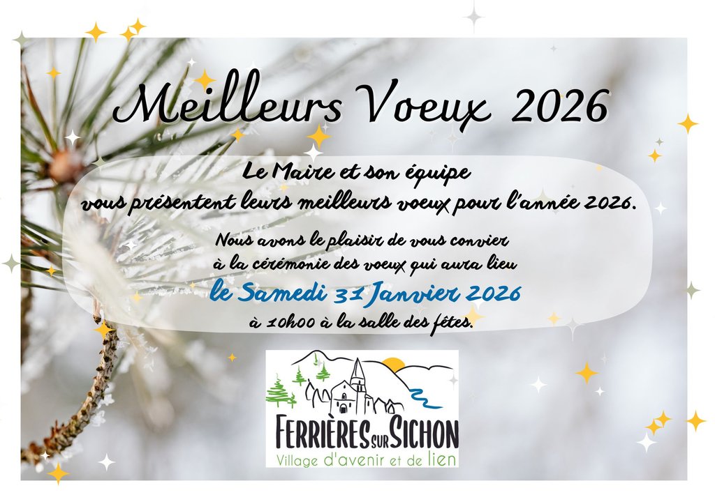 Toute l'équipe municipale autour de Monsieur le Maire, Jean-François Chauffrias,est heureuse de vous convier à la cérémonie des Voeux 2026 le samedi 31 janvier à 10h00 à la salle des fêtes.